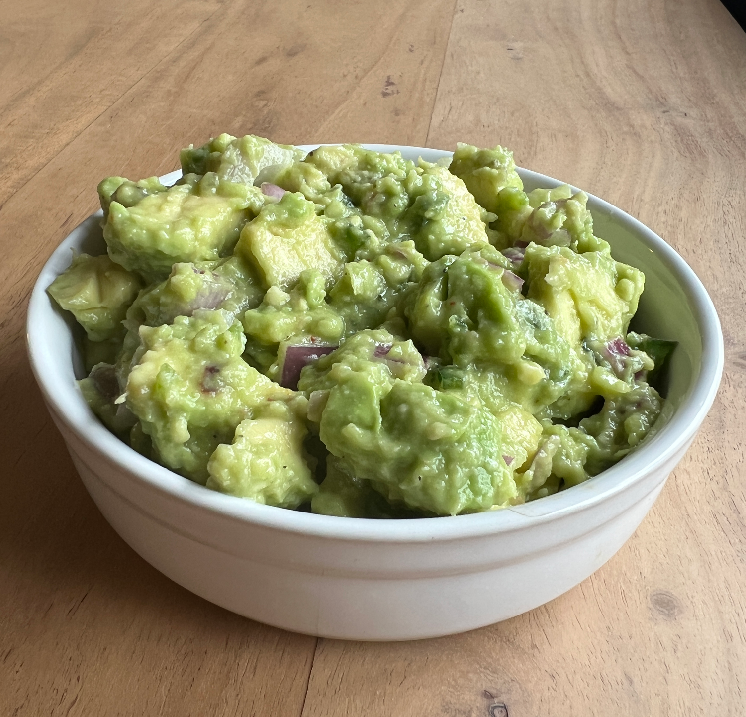 Add the lime juice and combine gently. Add the chopped jalapeño, onion, and red pepper, adding ½ jalapeño at first, and then slowly incorporating more to taste.