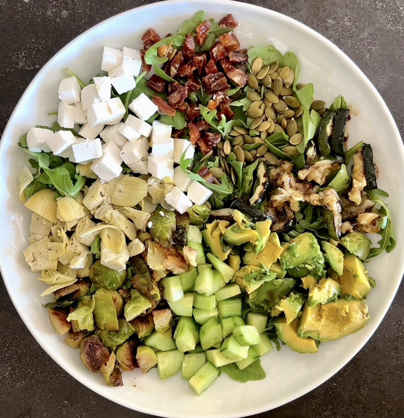 In a large bowl, using the arugula as a base, begin to build your salad. Layer in the crumbled vegan feta, cucumber, artichoke hearts, zuchini, pumpkin seeds, avocado, dates, and DIAMANDIA Easy AF Brussels Sprouts.