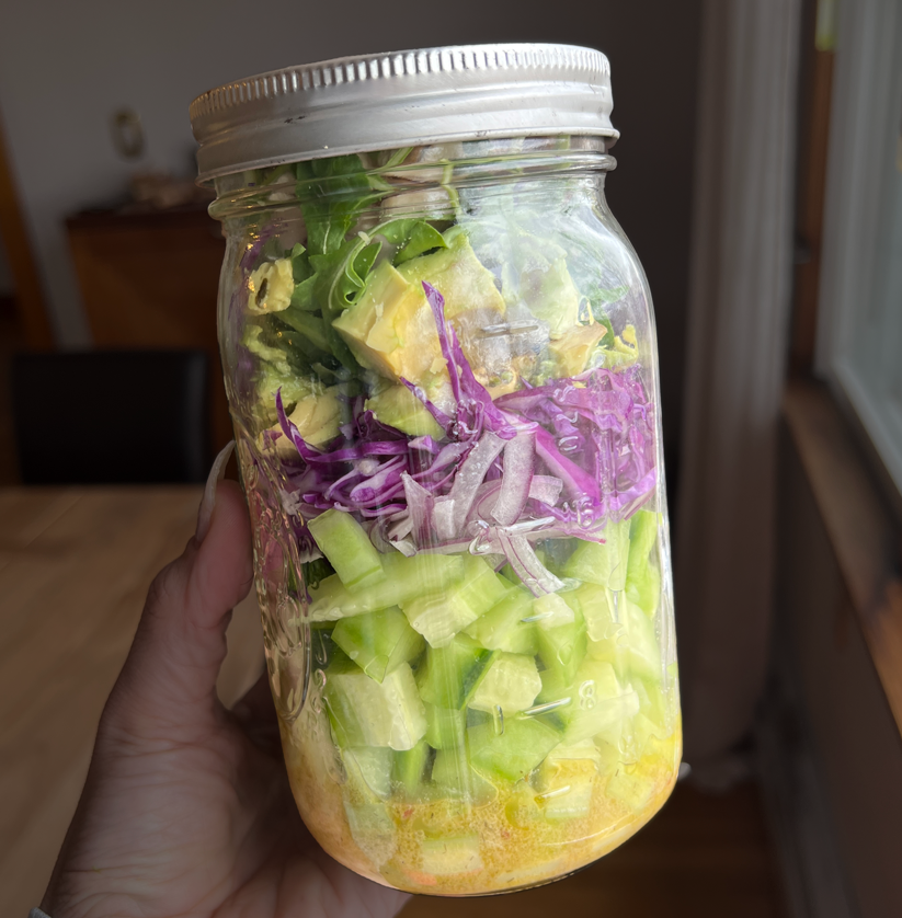 In your jar, begin to build your salad upwards using my DIAMANDIA Simple Dijon Vinaigrette as the base. Use a mandoline to slice red onion and cabbage. WEAR A GLOVE.