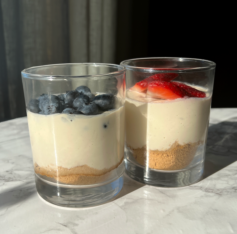 To assemble your cheesecake cups, top the crumb layer in each jar/glass with ~1/3 cup of the cheesecake mixture. Set in the refrigerator for 1 hour and then top the cheesecake mixture with fruit.
