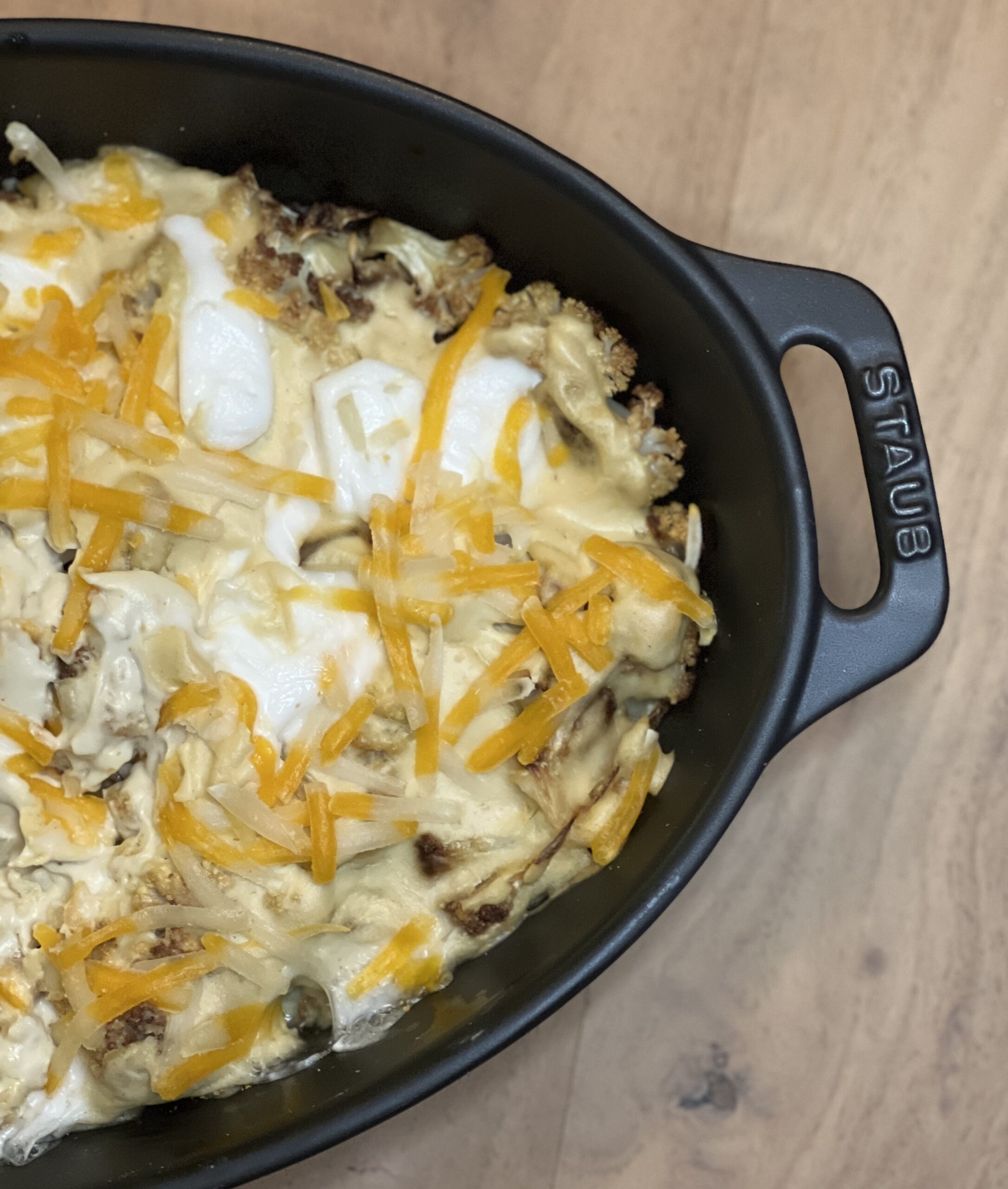 Add cauliflower to a Staub baking dish. Pour 1/2 the cashew sauce over the already cooked cauliflower. Sprinkle the chopped feta into the pan. Cover with the remaining cashew sauce. Top it off with the remaining 1/2 cup of colby cheese.