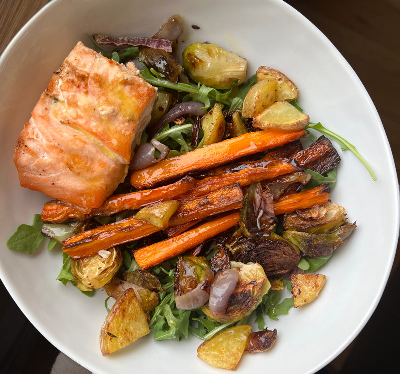 Assemble salad in a large bowl. Add arugula as the greens base. Stack all the roasted veggies on top of that. Add your protein by topping with DIAMANDIA Honey Ginger Salmon.