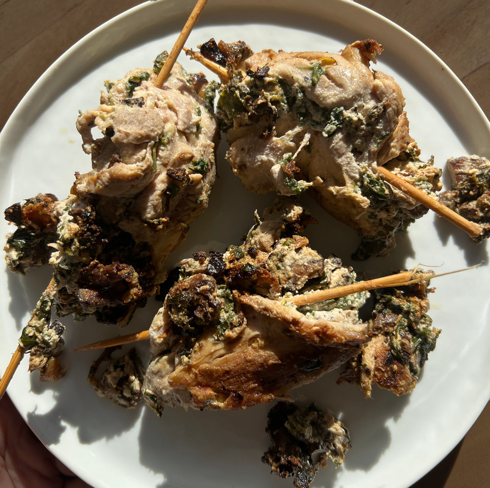 Add one scoop of the ricotta mixture to the inside of the flattened chicken. Roll the chicken up and insert a skewer to hold the seam of the chicken together.