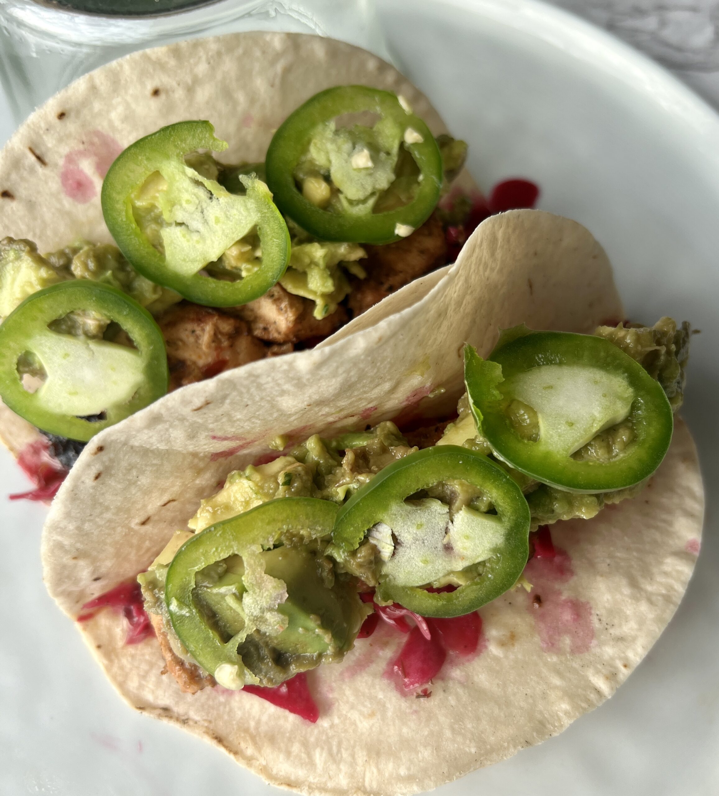 Stack your DIAMANDIA Spicy Cabbage Slaw in the shells. Add in the salmon. Add in DIAMANDIA Clean Simple Guacamole. Garnish with thin sliced jalapeños.