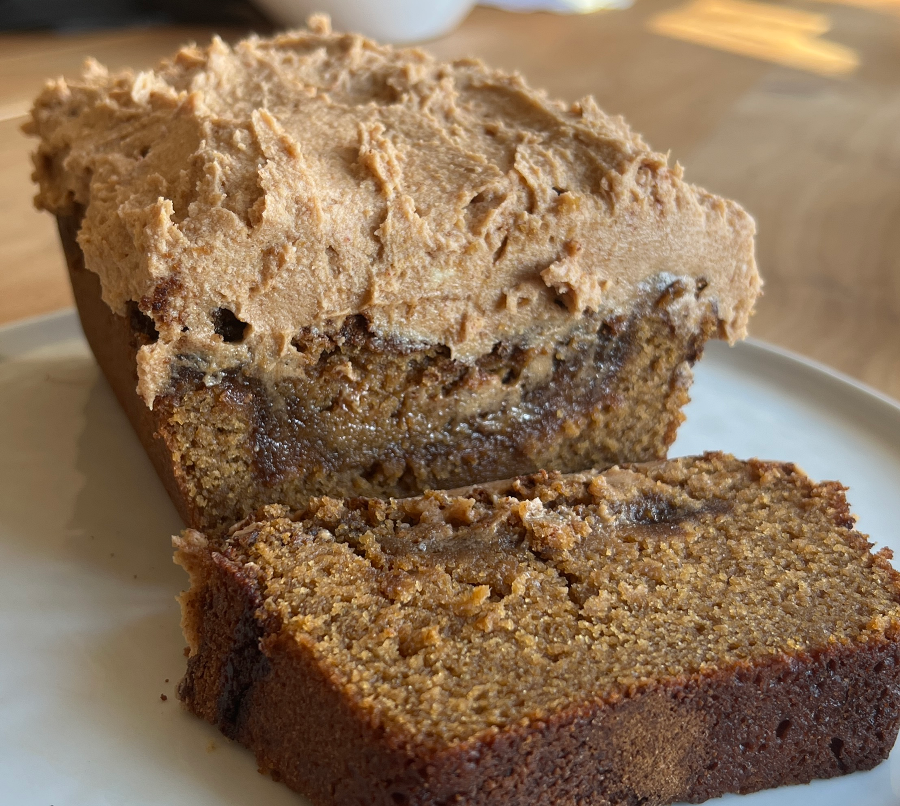 Spray loaf pan with coconut oil spray and pour half of the mixture, followed by half of the cinnamon sugar mixture. Swirl in.