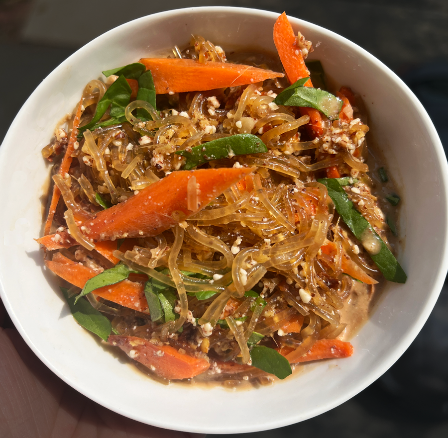 In a large bowl combine the kelp noodles, carrots, and green onions. Pour the dressing over this and mix well to combine.
