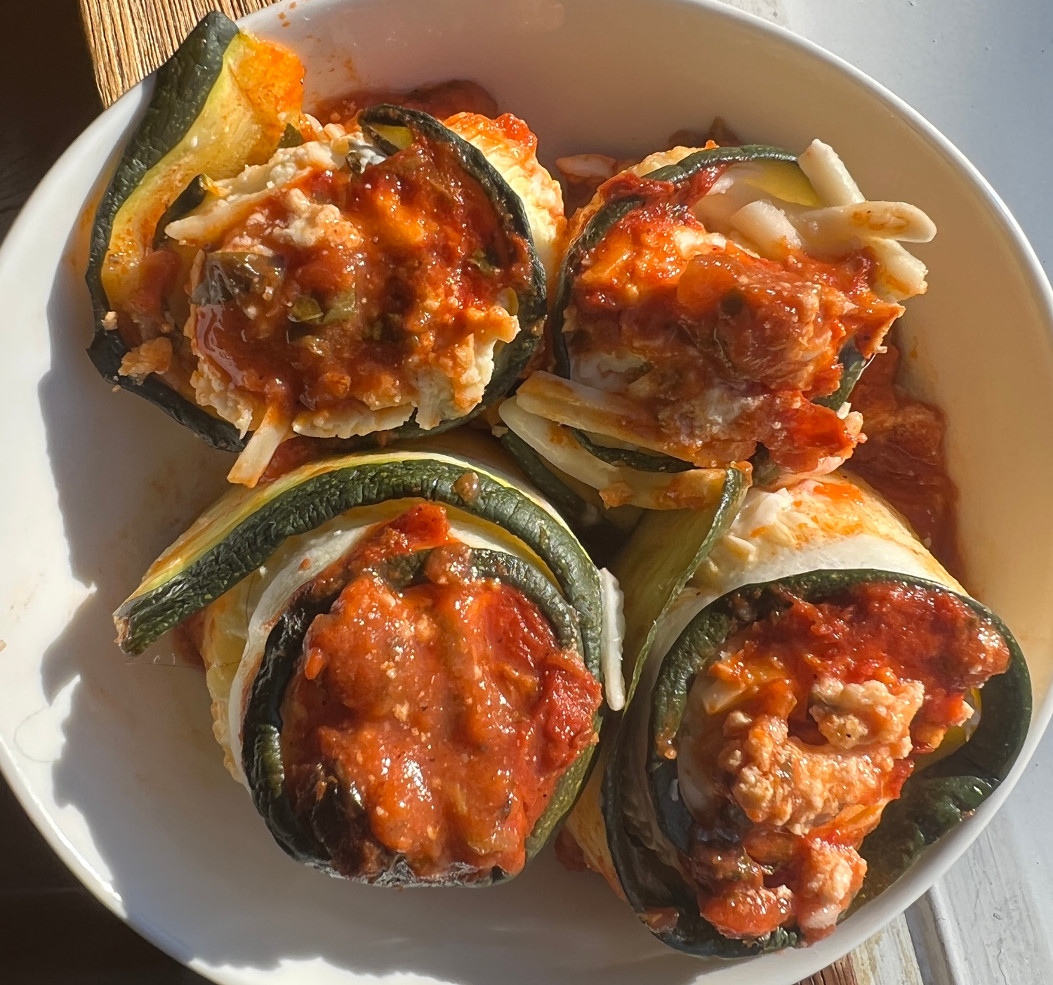 Line up zucchini, take 1 tablespoon of mixture, place in the center and roll up the zucchini. Place one by one in the baking dish. Roll side up.