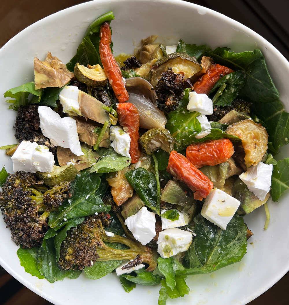 Add chopped vegan feta cheese and avocado. Add the dressing.